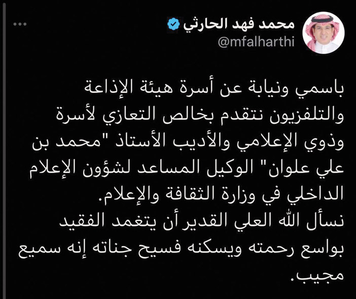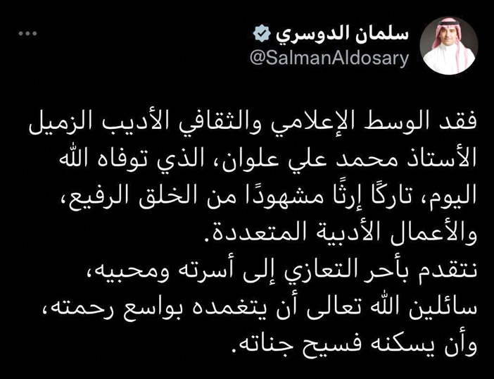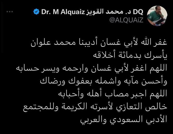 وسيصلى على الأديب محمد بن علي علوان بجامع الراجحي بعد صلاة اليوم الجمعة الموافق 1 سبتمبر وسيكون العزاء بمنزله في مدينة الرياض - حي الروابي نسأل الله أن يتغمده بواسع رحمته وللتواصل مع أبنائه: غسان 0546650000 حسان 0566441116