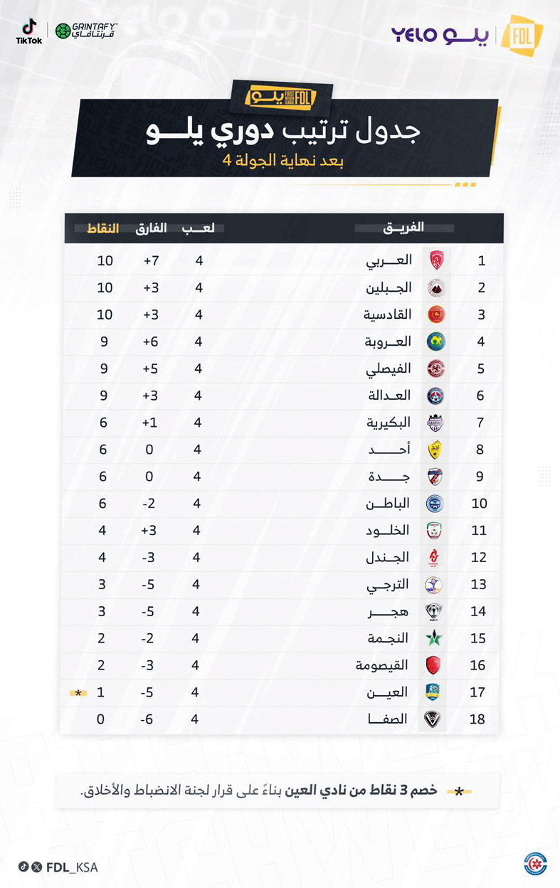 اعتلى أحمر عنيزة فريق العربي صدارة ترتيب فرق دوري يلو لأندية الدرجة الأولى قبل فترة التوقف، بعد فوزه على فريق القيصومة بأربعة أهداف مقابل هدفين، في اللقاء الذي جمع الفريقين على ملعب التعليم بعنيزة، ليرفع العربي رصيده إلى 10 نقاط في الصدارة.