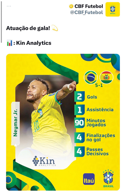فيما تغنى الاتحاد البرازيلي لكرة القدم باللاعب وبما قدمه من مستوى أمام منتخب بوليفيا في أول مباراة يلعبها منذ بضعة أشهر وحصوله فيها على جائزة أفضل لاعب.