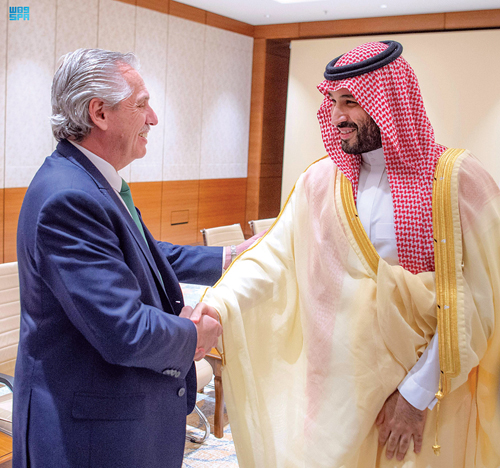 حضر اللقاء، صاحب السمو الأمير فيصل بن فرحان بن عبد الله وزير الخارجية، ومعالي وزير الدولة عضو مجلس الوزراء مستشار الأمن الوطني الدكتور مساعد بن محمد العيبان، ومعالي وزير التجارة الدكتور ماجد بن عبد الله القصبي، ومعالي وزير الاستثمار المهندس خالد بن عبد العزيز الفالح، ومعالي وزير المالية الأستاذ محمد بن عبد الله الجدعان، والوفد الرسمي لرئيس جمهورية الأرجنتين.