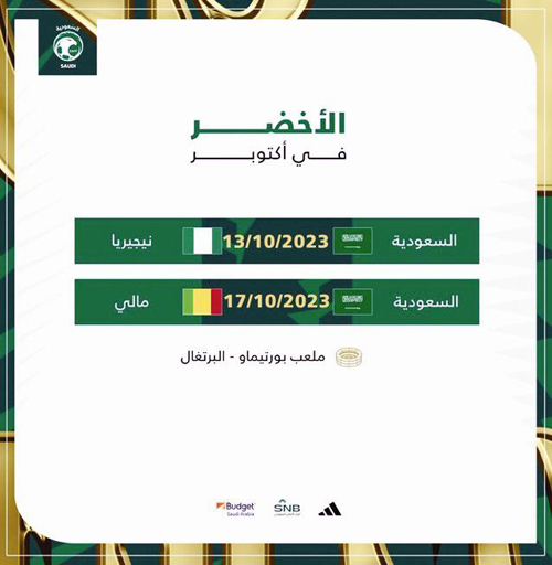 اذ سيلاقي منتخب نيجيريا يوم الجمعة 13 اكتوبر، ثم منتخب مالي يوم الثلاثاء 17 من الشهر ذاته، وستقام المباراتان في ملعب بورتيماو في البرتغال حيث سيعسكر الأخضر هناك في الفترة ذاتها في اطار المرحلة الثالثة من برنامج تحضيراته لنهائيات كأس آسيا 2023 التي ستقام في دولة قطر في شهر يناير 2024.