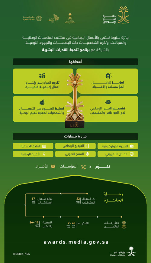 يُذكر أنّ الجائزة تستقبل مشاركات المؤسسات والأفراد، عبر المنصة الإلكترونية المخصصة: awards.media.gov.sa.