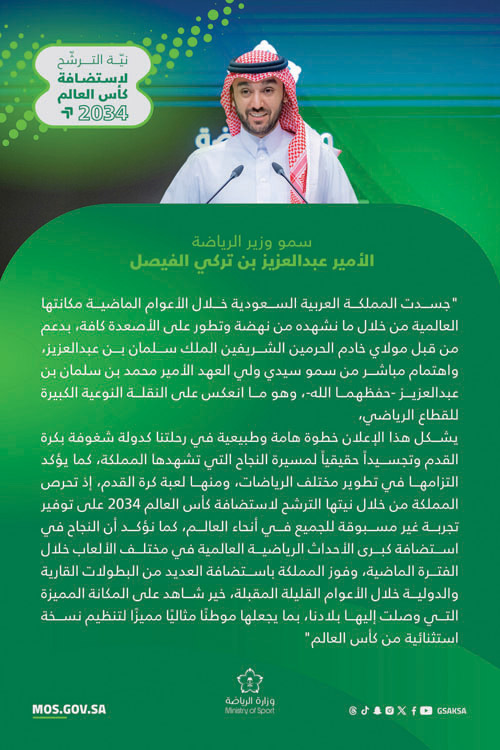 وبهذه المناسبة قال صاحب السمو الملكي الأمير عبدالعزيز بن تركي الفيصل وزير الرياضة رئيس اللجنة الأولمبية والبارالمبية السعودية: «جسدت المملكة العربية السعودية خلال الأعوام الماضية مكانتها العالمية من خلال ما نشهده من نهضة وتطور على الأصعدة كافة، بدعم من قبل مولاي خادم الحرمين الشريفين الملك سلمان بن عبدالعزيز، واهتمام مباشر من سمو سيدي ولي العهد الأمير محمد بن سلمان بن عبدالعزيز -حفظهما الله-، وهو ما انعكس على النقلة النوعية الكبيرة للقطاع الرياضي». وأضاف سموه: «ويشكل هذا الإعلان خطوة هامة وطبيعية في رحلتنا كدولة شغوفة بكرة القدم وتجسيداً حقيقياً لمسيرة النجاح التي تشهدها المملكة، كما يؤكد التزامها بتطويرمختلف الرياضات، ومنها لعبة كرة القدم، إذ تحرص المملكة من خلال نيتها الترشح لاستضافة كأس العالم 2034 على توفير تجربة غير مسبوقة للجميع في أنحاء العالم، كما نؤكد أن النجاح في استضافة كبرى الأحداث الرياضية العالمية في مختلف الألعاب خلال الفترة الماضية، وفوز المملكة باستضافة العديد من البطولات القارية والدولية خلال الأعوام القليلة المقبلة، خير شاهد على المكانة المميزة التي وصلت إليها بلادنا، بما يجعلها موطنًا مثاليًا مميزًا لتنظيم نسخة استثنائية من كأس العالم».