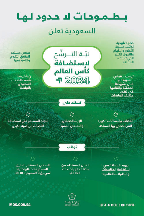 أعلنت المملكة العربية السعودية نيتها الترشح لاستضافة بطولة كأس العالم 2034، وفق خطة شاملة يسعى من خلالها الاتحاد السعودي لكرة القدم نحو تسخير كافة الإمكانات والطاقات لتوفير تجربة رائعة وغير مسبوقة لإسعاد عشاق كرة القدم في هذا الحدث العالمي بعد النجاحات الكبيرة التي تحققت في استضافة المملكة للعديد من الأحداث والفعاليات الرياضية العالمية. وأكد صاحب السمو الملكي الأمير محمد بن سلمان بن عبدالعزيز آل سعود ولي العهد رئيس مجلس الوزراء – حفظه الله – بهذه المناسبة، أن رغبة المملكة العربية السعودية في استضافة كأس العالم 2034 تعد انعكاسًا لما وصلت إليه - ولله الحمد - من نهضة شاملة على الأصعدة والمستويات كافة، الأمر الذي جعل منها مركزًا قياديًا وواجهة دولية لاستضافة أكبر وأهم الأحداث العالمية في مختلف المجالات، بما تملكه من مقومات اقتصادية وإرث حضاري وثقافي عظيم. وأبان سموه الكريم – حفظه الله – بأن نية الاستضافة تأتي تأكيدًا على الجهود الواضحة والكبيرة التي تقوم بها المملكة في نشر رسائل السلام والمحبة في العالم، والتي تعد الرياضة أحد أهم وأبرز أوجهها، لكونها وسيلة مهمّة لالتقاء الشعوب بمختلف أعراقهم وتعدد ثقافاتهم، وهو ما دأبت المملكة على تحقيقه في مختلف المجالات، ومنها المجال الرياضي. وتعد الرياضة رافدًا أساسيًا لنمو الاقتصاد وازدهاره، حيث تحرص المملكة على الاستثمار الأمثل في القطاع الرياضي من خلال العمل المستمر على تحقيق مستهدفات رؤية السعودية 2030 ، بما ينعكس على مستويات جودة الحياة لمواطني المملكة والمقيمين على أراضيها، وتوفير تجربة رائعة غير مسبوقة لعشّاق كرة القدم في العالم في عام 2034. وكانت المملكة قد نجحت باستضافة أكثر من 50 حدثا رياضيا دوليا منذ عام 2018 في مختلف الرياضات مثل كرة القدم ورياضة المحركات والجولف والرياضات الإلكترونية والتنس والفروسية وغيرها، كرّست من خلالها مكانتها كأحد أبرز الوجهات الرياضية العالمية. ويأتي هذا الإعلان لنية الترشح لاستضافة البطولة الأهم في عالم كرة القدم بعد 6 مشاركات سابقة للمنتخب السعودي كان آخرها في عام 2022.