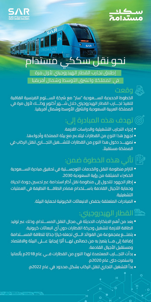 من جانبه، أكّد الرئيس التنفيذي لشركة «سار» الدكتور بشار بن خالد المالك التزام الخطوط الحديدية السعودية بدورها الوطني الرائد في تنفيذ مبادرات نوعية منبثقة من استراتيجية الشركة المرتبطة بالاستراتيجية الوطنية للنقل والخدمات اللوجستية، منوّهاً بأن القطار الهيدروجيني يعد من أهم الابتكارات الحديثة في مجال النقل المستدام، وذلك عبر توليد الطاقة اللازمة لتشغيل وحركة القطارات دون أي انبعاثات كربونية، حيث يتمتع بمجموعة من الفوائد التي تجعله خياراً جذّاباً للطاقة المستدامة إضافة إلى ما يتميز به من خصائص لها أثر إيجابي على البيئة والاقتصاد ومستقبل الأجيال القادمة.