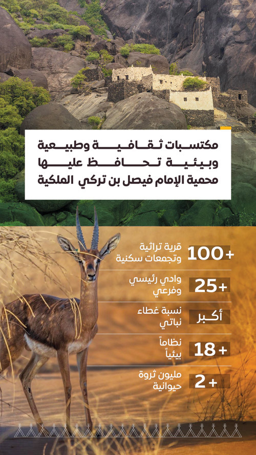 وقد تم إنشاء محمية الإمام فيصل بن تركي الملكية، استكمالاً لجهود المملكة المبذولة في المحافظة على الثروات التي تتمتع بها أراضيها شاسعة المساحات وتعظيم الأثر وفق أفضل الممارسات العالمية، لضمان استدامة البيئة لأجيال اليوم والمستقبل، بما يسهم في تجويد البيئة الطبيعية والنباتية والحياة الفطرية وتكاثرها وإنمائها، وفي تنشيط السياحة البيئية، والحد من الصيد والرعي الجائر ومنع الاحتطاب، والحفاظ على الغطاء النباتي، وزيادته، وتنظيم الحركة داخل المحميات بما لا يضر بالقرى والهجر وأملاك المواطنين، داخل نطاقها، وذلك من منطلق حرص القيادة الرشيدة - أيدها الله - على أن يستمتع المواطنون بهذه البلاد الطاهرة والمقيمون على أرضها بالمحميات الطبيعيةدون أسوار أو حواجز لكونها ملكاً عاماً للوطن، وفق الأنظمة والتعليمات المنظمة لذلك.