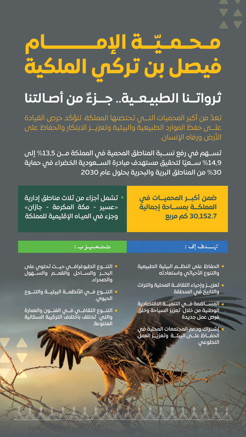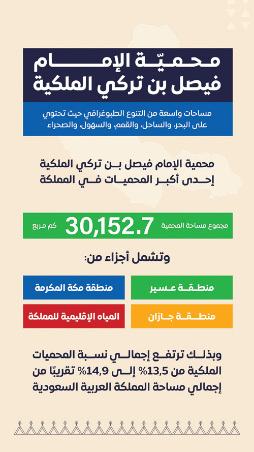 صدر أمر سامٍ كريم بإنشاء محمية ملكية باسم الإمام فيصل بن تركي الملكية، تمتد على ثلاث مناطق إدارية وهي عسير وجازان ومكة المكرمة، وصولًا إلى داخل المياه الإقليمية للمملكة في البحر الأحمر، لتكون ثامن المحميات الملكية السعودية، حيث تأتي ضمن إطار اهتمام القيادة الرشيدة - أيدها الله - في الحفاظ على التنوع البيئي والأحيائي للوصول إلى استدامة النظم البيئية، وتحسين إنتاجية النباتات، وحماية الأنواع المهددة بالانقراض، لتكون تحت إشراف مجلس المحميات الملكية التي يرأسها صاحب السمو الملكي الأمير محمد بن سلمان بن عبدالعزيز آل سعود، ولي العهد رئيس مجلس الوزراء - حفظه الله -.