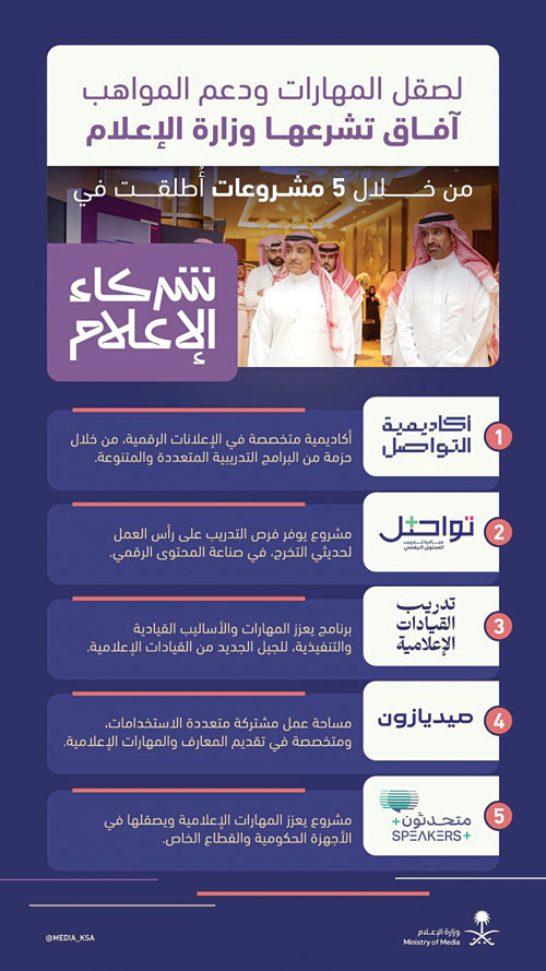 وأعلنت وزارة الإعلام خلال اللقاء إطلاق العديد من المشروعات الإعلامية الجديدة، وهي: أكاديمية التواصل، التي تهدف لتطوير القطاع الإعلاني في المملكة، وتمكين الموهوبين من تحسين مهاراتهم في مجال الإعلانات الرقمية.