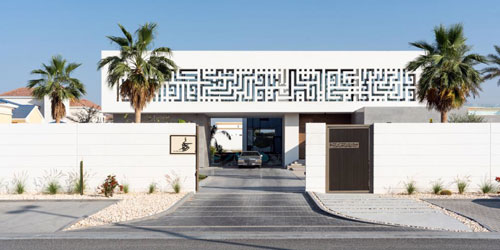 الواجهة الرئيسة للمبنى « ديواني « فهي المحور الرئيس للتعريف بهذا المشروع وهي مخطوطة بالخط الكوفي المربع للآية قرآنية « وقل رب أنزلني منزلا مباركا وأنت خير المنزلين « والتي خطها الخطاط زهير عفانة من الأردن مع بدايات المشروع ونفذت بإحدى الدول العربية على 80 قطعة حجر مصمتة بسماكة 10 سم مربع ، وتم جلبها من الخارج منفردة لتشكل هذه الآية الكريمة والتي تم إعادة تركيبها بالشارقة وبمقاس ارتفاع 3 متر وعرض 25 متر طولي ، إلا انها في نفس الوقت تمثل « المشربية « في فن العمارة الإسلامية القديمة ، كاستخدام وكشكل ، بالإضافة الى الزهو والجمال التي تضفيه منقوشة الآية في الفترة المسائية باستخدام الخلفيات اللونية من الإضاءة ، التي تعطيها ذات رونق معين كل ذات حسب موضوعه أو استخدامه مثلا ، في المناسبات بالأعياد الوطنية او يوم العلم ويوم الشهيد أو بمناسبات وطنية وعالمية أخرى يتم فيها استخدام ألوان معينة على المباني المميزة.