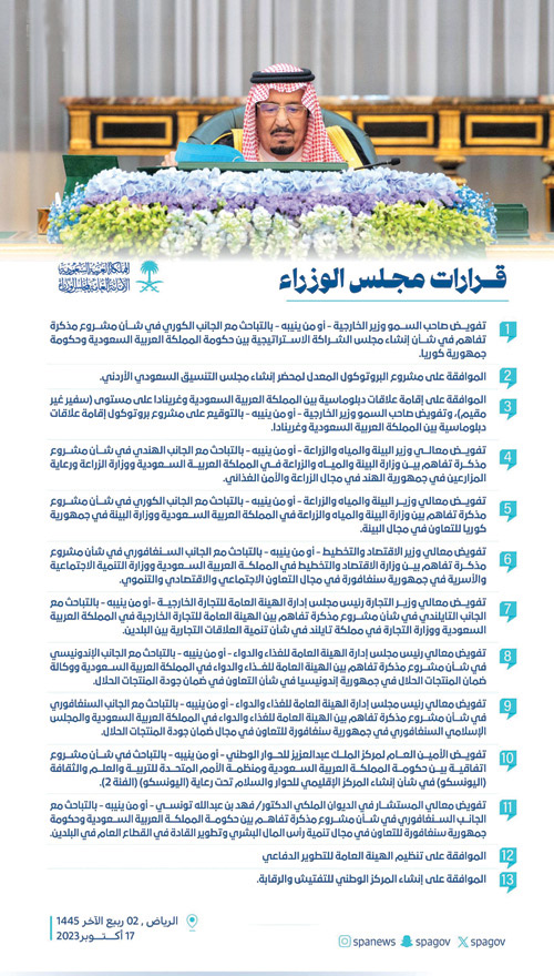 أولاً: تفويض صاحب السمو وزير الخارجية - أو من ينيبه - بالتباحث مع الجانب الكوري في شأن مشروع مذكرة تفاهم في شأن إنشاء مجلس الشراكة الاستراتيجية بين حكومة المملكة العربية السعودية وحكومة جمهورية كوريا.