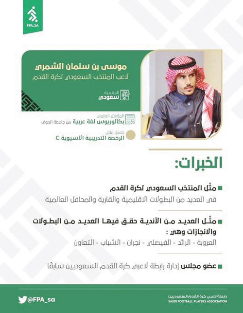 بناءً على قرار الجمعية العمومية لرابطة لاعبي كرة القدم السعوديين في اجتماعها غير العادي المنعقد يوم الأحد الماضي عبر وسائل التواصل المرئي، عقد مجلس الإدارة اجتماعًا لتسمية أعضاء مجلس الإدارة الجديد، وفيه قرر المجلس بالإجماع على تسمية كل من محمد السهلاوي رئيسًا، وموسى الشمري نائبًا للرئيس وعبدالملك الخيبري مشرفًا ماليًا وعضوية كل من صفوان المولد ومناف أبوشقير وناصر القحطاني وحسن معاذ.