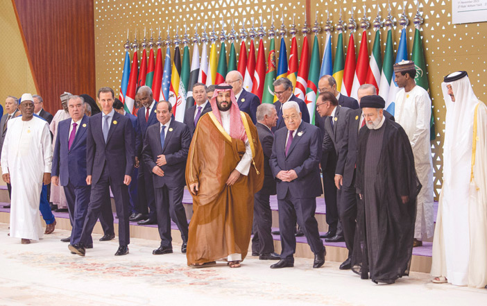يأتي انعقاد هذه القمة في ظروف استثنائية ومؤلمة، ونؤكد في هذا الصدد إدانتنا ورفضنا القاطع لهذه الحرب الشعواء التي يتعرض لها أشقاؤنا في فلسطين وراح ضحاياها الآلاف من المدنيين العزل ومن الأطفال والنساء والشيوخ، ودمرت فيها المستشفيات ودور العبادة والبنى التحتية.