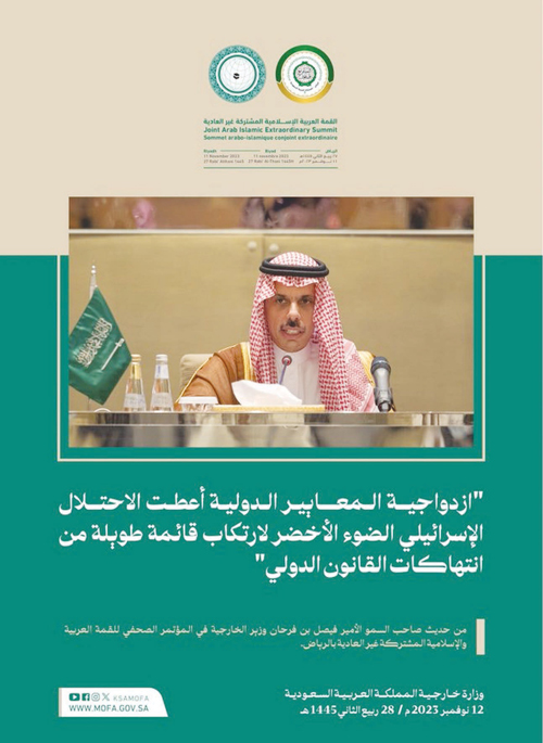 أكد صاحب السمو الأمير فيصل بن فرحان بن عبدالله وزير الخارجية أن ما يحدث في غزة عقاب جماعي تمارسه إسرائيل مشددا على أن الحرب في غزة يجب أن تتوقف، وأن السلام لن يتم إلا بالدولة الفلسطينية. وأكد وزير الخارجية في معرض رده على أسئلة الصحافيين خلال المؤتمر الصحفي الذي عقده أمس إثر اختتام القمة العربية الإسلامية المشتركة غير العادية بالرياض، أكد أن هناك دولا تبرر خروقات إسرائيل للقانون الدولي، مشيراً إلى أنهم يراقبون عن كثب ازدواجية معايير الغرب ونقيّم مواقفنا. وأضاف أن التنسيق بين الدول العربية والإسلامية بشأن غزة كبير، وأن التحول في المواقف حول غزة ليس كافياً، مؤكداً ضرورة وقف الحرب وحماية المدنيين. وأكد وزير الخارجية على مواصلة ممارسة الضغط على ازدواجية المعايير، وتقاعس المجتمع الدولي، وفي ذات الوقت أكد على وجوب أن يكون هناك فرصة لإحياء السلام. وتابع قائلاً «نحن ننادي بالسلام، والطرف الآخر يبتعد عنه».