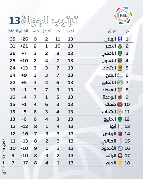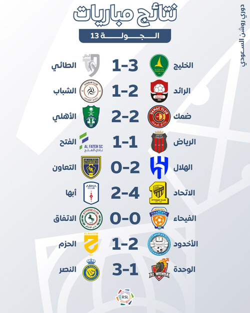 في ختام مباريات الجولة الـ13 فرض المنطق نفسه في لقاء الوحدة والنصر، فانتصر الأصفر بثلاثية مقابل هدف عززت من وصافته للمتصدر واحتفظ بفارق الأربع نقاط، وفي نجران قاد المهاجم توامبا فريق الأخدود لانتصار مهم على الحزم بتسجيله لهدفي فريقه على مدار الشوطين مقابل هدف وحيد للحزم، وفي المجمعة تعادل الاتفاق مع الفيحاء سلبياً بدون أهداف..