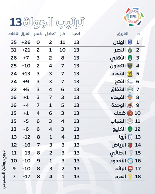 ساهمت نتائج الجولة 13 لدوري روشن للمحترفين في إشعال المنافسة على لقب دوري روشن، وواصل الهلال (المتصدر) والنصر الوصيف انتصاراتهما المتتالية، حيث كسب الهلال التعاون في الرياض بنتيجة 2/0 وكسب النصر مستضيفه الوحدة 3/1، مواصلة الهلال والنصر رحلة الانتصارات المتتالية جعلت الترشيحات المبكرة لصالح الفريقين، ولأن الدوري طويل، حيث تبقى 21 جولة سيحدث خلالها الكثير من المتغيرات مما يجعل المنافسة على اللقب متاحة لستة فرق وهي الهلال والنصر والأهلي والتعاون والاتحاد والفتح (أصحاب المراكز الستة الأولى)، والكثير من المتابعين والمحللين يرى أن نتيجة مواجهة الهلال والنصر يوم الجمعة 1 ديسمبر ضمن الجولة 15 ستضاعف حظوظ الفريق الفائز بالمباراة للفوز باللقب، وهي مجرد توقعات وتكهنات ربما لا تتحقق إذا نظرنا لعدد الجولات المتبقية، وتقلب المستويات والنتائج، ومعاناة بعض الفرق المنافسة من الإصابات والإيقافات بسبب تراكم الكروت.