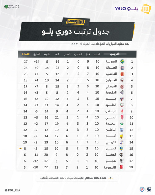 بعد مرور 10 جولات من دوري يلو لأندية الدرجة الأولى للمحترفين تتصدر ثلاثة فرق مقدمة الدوري، وهي البطاقات الثلاث للصعود لدوري روشن للمحترفين، حيث يتصدر العروبة فرق الدوري برصيد 27 نقطة يليه فريق العدالة برصيد 24 نقطة، ثم القادسية في المركز الثالث برصيد 23 نقطة، ثم الجبلين رابعاً والذي يبتعد بفارق 5 نقاط عن المركز الثالث، حيث يملك 18 نقطة.