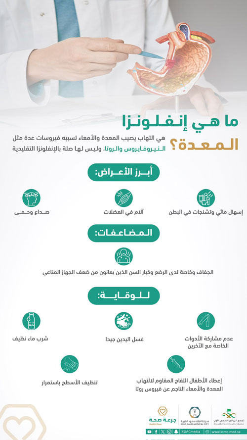 وجهت مدينة الملك سعود الطبية عدة نصائح للوقاية من إنفلونزا المعدة، تتمثل في إعطاء الأطفال اللقاح المقاوم لالتهاب المعدة والأمعاء الناجم عن فيروس روتا، إلى جانب غسل اليدين جيدًا وشرب ماء نظيف، وكذلك الابتعاد عن المصابين بالفيروس، بالإضافة إلى استخدام الأدوات الخاصة وعدم مشاركتها مع الآخرين في المنزل، وكذلك تنظيف الأسطح باستمرار. وأوضحت المدينة بأن إنفلونزا المعدة ليس لها صلة بالإنفلونزا التقليدية، وإنما هي عبارة عن التهاب يصيب المعدة والأمعاء تسببه فيروسات عدة أهمها النوروفايروس وفيروس الروتا، مشيرة إلى أن إنفلونزا المعدة تهاجم الأمعاء مما يسبب علامات وأعراض مثل: إسهال مائي وتشنجات البطن والألم والغثيان والقيء وألم العضلات أو الصداع والحمى، حيث يصبح الشخص عرضة للإصابة بإنفلونزا المعدة عند تناول طعام أو شراب يحتوي على الفيروس أو مشاركة أدواته مثل المنشفة والطعام الخاص به مع شخص حامل للعدوى.