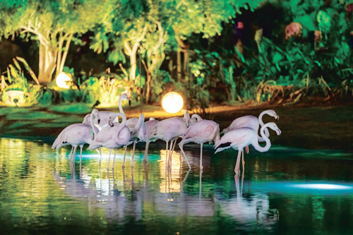 ومن أمام شلال المياه العملاق، يقضي الزوار أوقاتا رائعة بمشاهدة طيور الفلامنجو التي ترمز للأناقة والرشاقة وسط أحضان الطبيعة، في مشهد يعكس جمال المكان وخصائصه المميزة، كما يستمتع زوار المنطقة بمسرح مصغر للعروض الموسيقية الحية وعدد من الفعاليات المتنوعة المبهجة.
