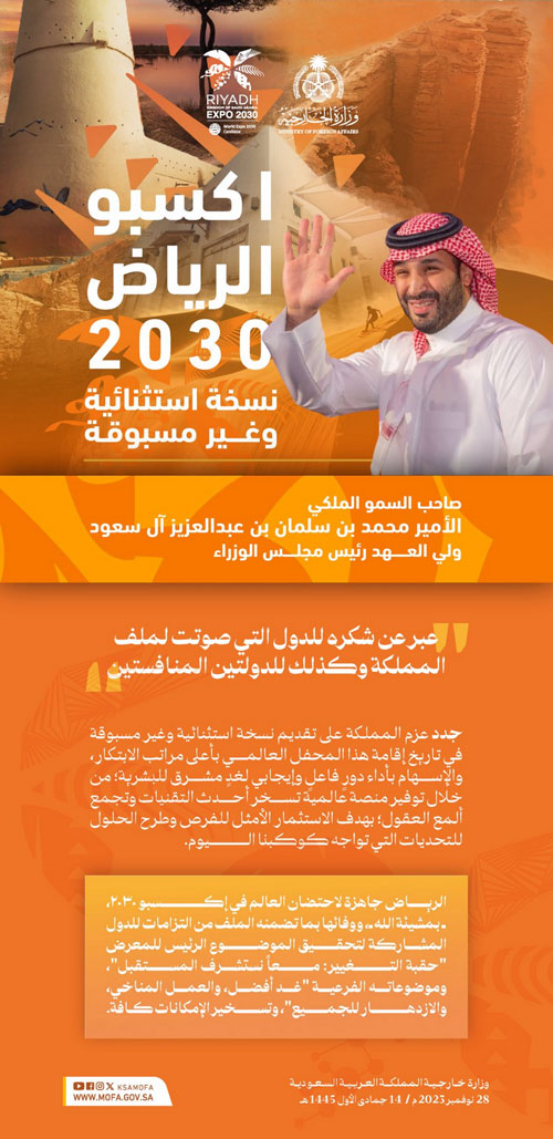 رفع صاحب السمو الملكي الأمير محمد بن سلمان بن عبدالعزيز آل سعود ولي العهد رئيس مجلس الوزراء -حفظه الله- التهنئة لخادم الحرمين الشريفين الملك سلمان بن عبدالعزيز آل سعود -رعاه الله- بمناسبة فوز المملكة العربية السعودية باستضافة معرض إكسبو 2030 بمدينة الرياض. جاء ذلك عقب إعلان المكتب الدولي للمعارض أمس الثلاثاء، فوز ملف المملكة باستضافة المعرض خلال الفترة من أكتوبر 2030 حتى مارس 2031، كما عبر سموه عن شكره للدول التي صوتت لملف المملكة، وكذلك للدولتين المنافستين. وقال سمو ولي العهد -حفظه الله- بهذه المناسبة: «يأتي فوز المملكة باستضافة معرض إكسبو 2030 ترسيخًا لدورها الريادي والمحوري والثقة الدولية التي تحظى بها، والذي يجعل منها وجهة مثالية لاستضافة أبرز المحافل العالمية، حيث يعد معرض إكسبو واحداً منها». وجدد سموه عزم المملكة على تقديم نسخة استثنائية وغير مسبوقة في تاريخ إقامة هذا المحفل العالمي بأعلى مراتب الابتكار، والإسهام بأداء دورٍ فاعلٍ وإيجابي لغدٍ مشرق للبشرية؛ من خلال توفير منصة عالمية تسخر أحدث التقنيات وتجمع ألمع العقول؛ بهدف الاستثمار الأمثل للفرص وطرح الحلول للتحديات التي تواجه كوكبنا اليوم. وقال سموه: «ستتزامن استضافتنا لإكسبو 2030 مع عام تتويج مستهدفات وخطط رؤية السعودية 2030؛ حيث يعد المعرض فرصة رائعة نشارك العالم خلالها الدروس المستفادة من رحلة التحول غير المسبوقة». وأكد سمو ولي العهد، أن الرياض جاهزة لاحتضان العالم في إكسبو 2030، ـ بمشيئة الله ـ، ووفائها بما تضمنه الملف من التزامات للدول المشاركة لتحقيق الموضوع الرئيس للمعرض «حقبة التغيير: معاً نستشرف المستقبل»، وموضوعاته الفرعية «غد أفضل، والعمل المناخي، والازدهار للجميع»، وتسخير الإمكانات كافة. وتتميز الرياض العاصمة لبلدٍ يتمتع بموقع جغرافي استراتيجي ومهم، فهي تعد جسراً مهماً يربط القارات ببعضها، الأمر الذي يجعل منها وجهة جاذبة لأبرز المحافل الدولية والاستثمارات العالمية والزيارة، وبوابةً للعالم. وكان ملف ترشح المملكة لاستضافة الرياض معرض إكسبو الدولي 2030، قد حظي بالدعم الكبير والمباشر من صاحب السمو الملكي ولي العهد رئيس مجلس الوزراء -حفظه الله- بدايةً من إعلان المملكة في 29 أكتوبر 2021 عن تقدمها بطلب رسمي إلى المكتب الدولي للمعارض BIE (الهيئة المنظمة لمعرض إكسبو الدولي). الجدير بالذكر أن المكب الدولي للمعارض أعلن فوز ملف المملكة بالاستضافة بعد اقتراع سريّ خلال اجتماع الجمعية العمومية للمكتب (173)، في باريس، أمس حيث حصد ملف المملكة (119) صوتاً من الدول الأعضاء، وتنافست على الاستضافة إلى جانب الرياض مدينتان هما: بوسان الكورية الجنوبية، وروما الإيطالية.