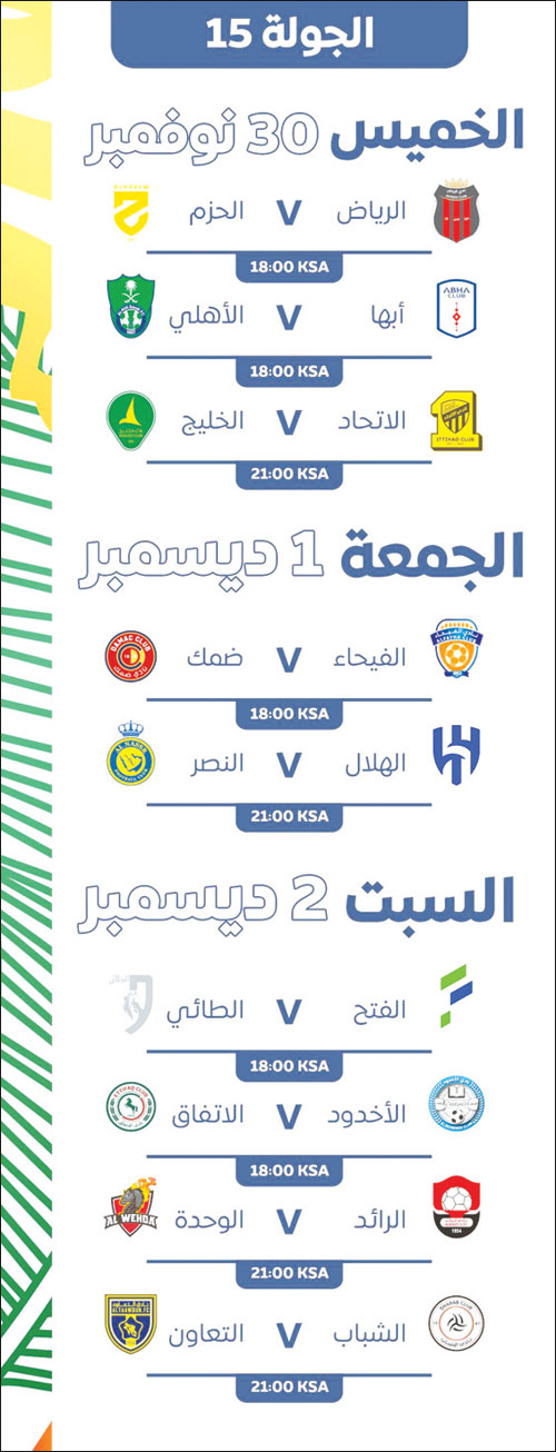 تفتتح ساء اليوم الخميس الجولة الأكثر حساسية ضمن دوري روشن للمحترفين وهي الجولة الخامسة عشرة والتي تعتبر مفصلية بشكل كبير قبل نهاية الدور الأول بجولتين، وستقام اليوم ثلاث مباريات على أن تستكمل الجولة يومي الجمعة والسبت بستة لقاءات.