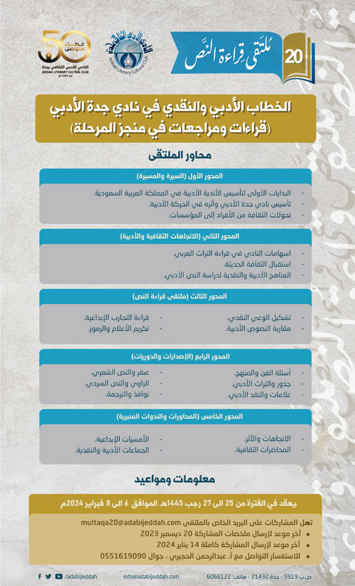 وجاء اختيار محور ملتقى قراءة النص العشرين وذلك بمناسبة مرور خمسين عاماً على إنشاء نادي جدة الأدبي الثقافي الذي يعد أقدم وأعرق نادٍ أدبي شهد تجاذبات فكرية معرفية وثقافية عبر تاريخه الطويل المديد فتح منبره لعدد كبير من كبار الشعراء والأدباء والنقاد في العالم العربي.