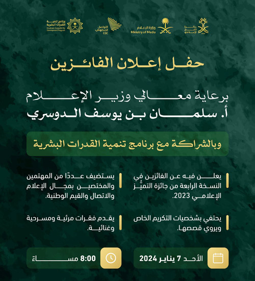 يرعى معالي وزير الإعلام الأستاذ سلمان الدوسري، الحفل الذي يقيمه مركز التواصل الحكومي في وزارة الإعلام لتكريم الفائزين بجائزة التميُّز الإعلامي 2023 في نسختها الرابعة، بالشراكة مع برنامج تنمية القدرات البشرية. ويقام الحفل عند الساعة الثامنة من مساء يوم الأحد القادم في قاعة فندق فورسيزونز في برج المملكة.