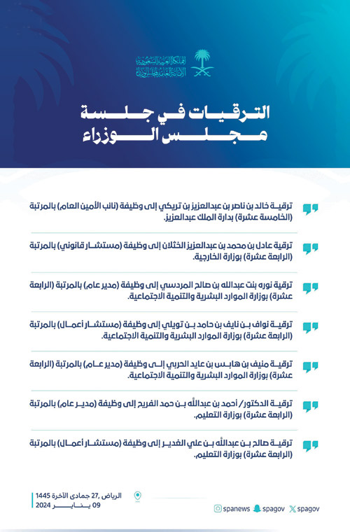 - ترقية عادل بن محمد بن عبدالعزيز الخثلان إلى وظيفة (مستشار قانوني) بالمرتبة (الرابعة عشرة) بوزارة الخارجية. - ترقية نورة بنت عبدالله بن صالح المردسي إلى وظيفة (مدير عام) بالمرتبة (الرابعة عشرة) بوزارة الموارد البشرية والتنمية الاجتماعية.