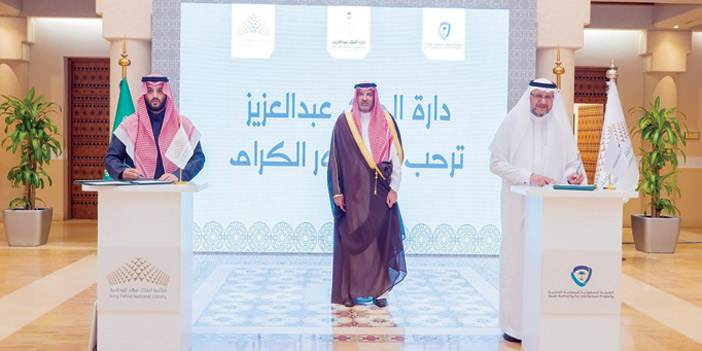 ووقع الاتفاقية من جانب مكتبة الملك فهد الوطنية، صاحب السمو الملكي الأمير خالد بن طلال بن بدر الأمين العام المكلف للمكتبة، ومن جانب دارة الملك عبدالعزيز الرئيس التنفيذي تركي بن محمد الشويعر، ومن جانب الهيئة السعودية للملكية الفكرية الدكتور عبدالعزيز بن محمد السويلم، الرئيس التنفيذي للهيئة.
