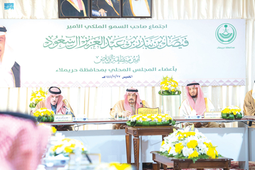 على صعيد آخر أكد صاحب السمو الملكي الأمير فيصل بن بندر بن عبدالعزيز أمير منطقة الرياض، أن زيارة محافظة حريملاء وبقية محافظات المنطقة تأتي وفقًا لتوجيهات القيادة الرشيدة - أيدها الله - للاهتمام بكل ما يخدم المواطن، مشيرًا إلى أن المشروعات التي تم تدشينها تأتي لخدمة المواطن والمقيم في محافظة حريملاء والمراكز التابعة لها. جاء ذلك خلال رئاسة سموه اجتماع المجلس المحلي بمحافظة حريملاء. وأفاد سموه بأنه تم مناقشة عدد من الموضوعات البلدية والتعليمية والطرق ومراجعة الضوابط والمعايير المعمول بها مع الجهات ذات العلاقة مثل بحث رفع فئة البلدية، وتوسعة طرق (الرياض - حريملاء) واستكمال طرق (البرة - رغبة - العويند - ضرماء)،مبينًا أن هناك ما تم إنجازه واستكماله، وهناك ما سيتم العمل على استكماله بإذن الله. وأشار إلى أنه تم مناقشة أيضًا وضع طريق (صلبوخ - ملهم) وما يشهده من كثافة للشاحنات، إضافة إلى تغطية شبكات الاتصالات والمياه بالمحافظة، مفيدًا أنه تم بحث المشروعات المتأخرة والمتعثرة في المحافظة التي تم معالجتها.