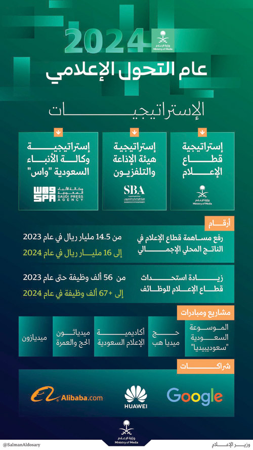 أكد معالي وزير الإعلام الأستاذ سلمان بن يوسف الدوسري, أن الإعلام السعودي ينتظره مستقبل حافل بالمنجزات والتحوّلات المنشودة في مختلف قطاعاته، مبينًا أبرز الملامح الإستراتيجية لمنظومة الإعلام للعام الجاري، التي سيتم تحقيقها بعدد من المبادرات والمشروعات والبرامج والأعمال، معلنًا أن عام 2024 هو عام التحول الإعلامي في المملكة، والاستعداد لمصافحة حارّة بين الإعلام السعودي والمستقبل.