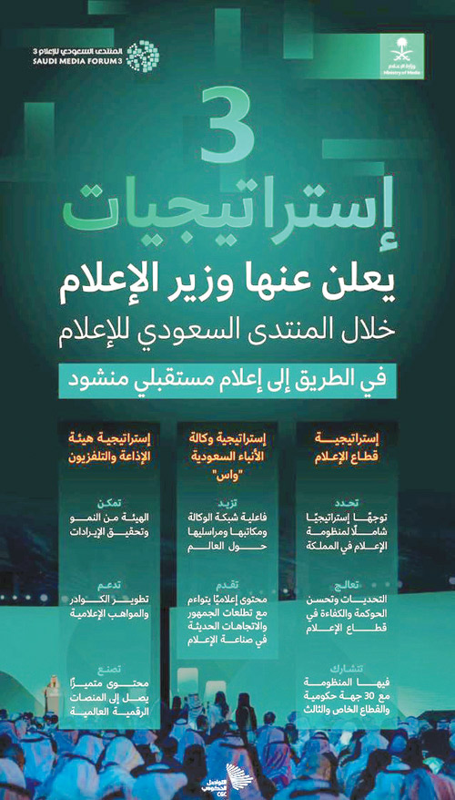 وأعلن عن ثلاث إستراتيجيات تسير عليها منظومة الإعلام وتمثل خارطة طريق نحو إعلام المستقبل، وتسهم في تعزيز القطاع الإعلامي، ورفع الجاذبية الاستثمارية، وتعزيز كفاءة الكوادر الوطنية، التي تتمثل في تحديد التوجه الإستراتيجي الشامل لمنظومة الإعلام في المملكة، وتحسين حوكمة وكفاءة قطاع الإعلام، بالشراكة مع أكثر من 30 جهة حكومية، بالإضافة إلى القطاع الخاص والقطاع الثالث.