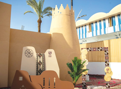 وأقيمت الاحتفالية داخل قرية شعبية أقيمت خصيصا في مقر النادي وسط جو شعبي يحاكي ماكانت عليه بلادنا في بداية تأسيسها ببيت الشعر ومجسمات للمصمك والبيوت القديمة.