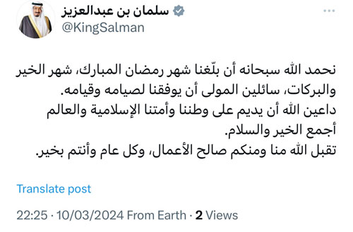 أبنائي وبناتي إخواني وأخواتي المواطنين والمقيمين في المملكة العربية السعودية والمسلمين في كل مكان السلام عليكم ورحمة الله وبركاته: نُهنئكم بحلول شهر رمضان المبارك، ونحمد الله أن بلغنا شهر الرحمة والمغفرة والعتق من النيران، ونسأله سبحانه بمنّه وفضله أن يجعلنا وإياكم ممن يصوم رمضان ويقومه إيماناً واحتساباً. ونحمد الله جل وعلا، على ما أنعم به على هذه البلاد، المملكة العربية السعودية، بأن جعلها مهداً للإسلام، بانطلاق رسالة الإسلام من أرضها، واختصها بخدمة الحرمين الشريفين ورعايتهما والعناية بهما، وبقاصديهما من حجاج ومعتمرين وزائرين، وأكرمها بخدمة المشاعر المقدسة، وتطوير عمارة الحرمين الشريفين، والقيام على مشروعات توسعاتهما المتواصلة؛ وهو محل فخر واعتزاز للمملكة قيادة وشعباً، وهو ما سارعليه ملوكها منذ توحيدها، على يد الملك عبدالعزيز بن عبدالرحمن - طيب الله ثراه – حتى يومنا هذا، انطلاقاً من دورها الريادي في خدمة الإسلام والمسلمين.كما نُهنئ جنودنا البواسل المرابطين في الحدود والثغور من منسوبي القطاعات العسكرية والأمنية كافة، وكل العاملين في قطاعات الدولة الذين يتفانون في خدمة وطنهم، داعين الله أن يجزيهم خير الجزاء. وإذ يؤلمنا أن يحل شهر رمضان هذا العام، في ظل ما يعانيه أشقاؤنا في فلسطين من اعتداءات، فإننا نؤكد ضرورة اضطلاع المجتمع الدولي بمسؤولياته، لإيقاف هذه الجرائم الوحشية، وتوفير الممرات الإنسانية والإغاثية الآمنة. نسأل الله تعالى أن يجعل في هذا الشهر الكريم الخير والسلام، للأمة الإسلامية والعالم أجمع، وأن يديم على بلادنا الأمن والأمان والرخاء، ويتقبل منا ومنكم الصيام والقيام. والسلام عليكم ورحمة الله وبركاته.
