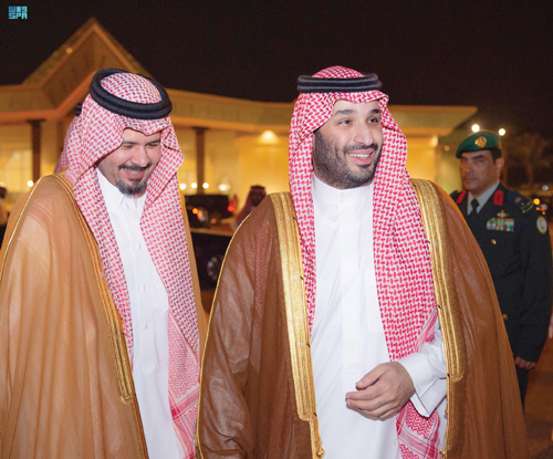وقد غادر بمعية سمو ولي العهد، صاحب السمو الملكي الأمير تركي بن محمد بن فهد بن عبدالعزيز وزير الدولة عضو مجلس الوزراء، وصاحب السمو الملكي الأمير عبدالعزيز بن تركي بن فيصل بن عبدالعزيز وزير الرياضة، وصاحب السمو الملكي الأمير عبدالله بن بندر بن عبدالعزيز وزير الحرس الوطني، وصاحب السمو الملكي الأمير سعود بن سلمان بن عبدالعزيز، ومعالي وزير الدولة عضو مجلس الوزراء الشيخ صالح بن عبدالعزيز آل الشيخ، ومعالي عضو هيئة كبار العلماء المستشار في الديوان الملكي الشيخ الدكتور سعد بن ناصر الشثري، وأصحاب المعالي الوزراء.