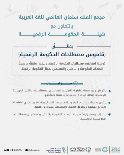 يطلقُ مجمع الملك سلمان العالمي للغة العربية بالتعاون مع هيئة الحكومة الرقمية قاموسَ: «مصطلحات الحكومة الرقمية» باللغة العربية؛ توحيداً لمفاهيم مصطلحات الحكومة الرقمية، وتفادياً لاختلافها، واضطراب ترجماتها؛ لضمان اتساقها عند تداولها، وإيجاد مرجعيَّة موثوقة موحَّدة للجهات الحكومية والباحثين والمهتمين بمجال الحكومة الرقمية. وثمَّن الأمين العام للمَجْمع الدكتور عبدالله بن صالح الوشمي دعمَ صاحب السمو الأمير بدر بن عبدالله بن فرحان وزير الثقافة رئيس مجلس الأمناء والمتابعة المقدمة من سموه في إطلاق القاموس.