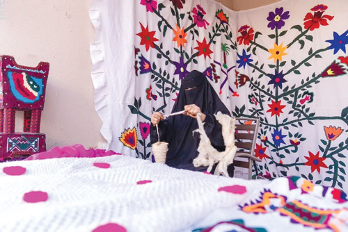 وتقول أم علا إحدى المشاركات بحرفة الكروشية إن هذه الحرفة عبارة عن حياكة من خلال إبر صغيرة تسمى «السنارة» ومن ثم صناعة العديد من المنتجات مثل بعض قطع الملابس والمفارش والحقائب وغيرها من مستلزمات المنزل والأسرة.