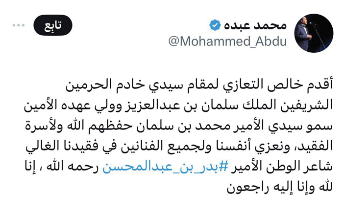 وكان قد أعلن أمس فنان العرب محمد عبده عن تلقيه جلسات علاج بالكيماوي، في أحد مستشفيات العاصمة الفرنسية باريس وجدة، «في إشارة لتعرضه لمرض السرطان، وعلاجه في مراحله الأخيرة وتماثله للعلاج بحسب مصادر مقربة»، وذلك على أثر آخر تسجيل صوتي «مؤثر» أرسله للأمير الراحل بدر بن عبدالمحسن، قبل وفاته بأيام.
