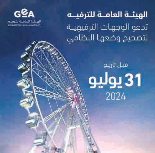 دعت الهيئة العامة للترفيه كل المنشآت الترفيهية الواقعة ضمن اختصاصها، بما في ذلك «المدن الترفيهية» و»مراكز الترفيه»، إلى الالتزام بالأنظمة واللوائح الصادرة عنها والحصول على التراخيص اللازمة للنشاط قبل الموعد النهائي المحدد في 31 يوليو 2024م، وذلك انطلاقاً من دور الهيئة في رفع مستوى جودة الخدمات الترفيهية في المملكة، وكخطوة أساسية لضمان تقديم تجارب ترفيهية آمنة وممتعة للزوار ولتعزيز مكانة المملكة كوجهة ترفيهية رائدة.