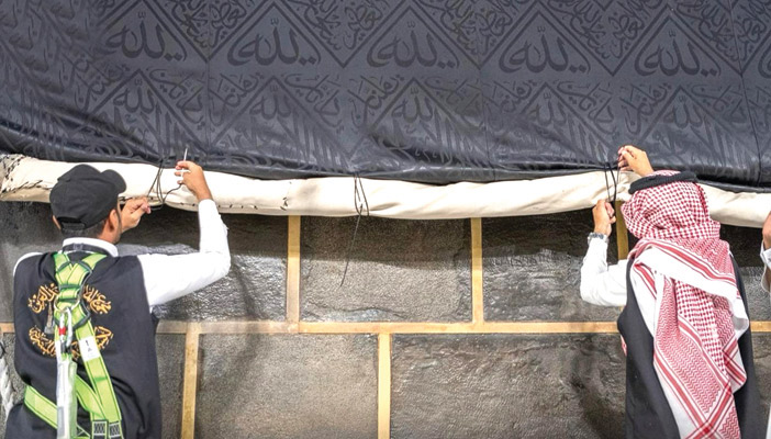 تواصل الهيئة العامة للعناية بشؤون الحرمين الشريفين، عمليات الحفاظ على نظافة وسلامة كسوة الكعبة المشرفة ومنع العبث بها، حيث تم أمس رفع الجزء السفلي من الكسوة، جريًا على العادة السنوية، بارتفاع ثلاثة أمتار وفق الخطة المعتمدة لموسم الحج، فيما تمت تغطية الجزء المرفوع بإزار من القماش القطني الأبيض بعرض مترين ونصف وطول 54 متراً من الجهات الأربع.