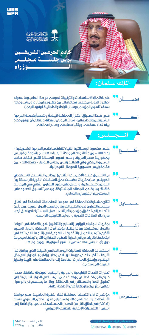 وتناول مجلس الوزراء، نتائج مشاركات المملكة في عددٍ من الاجتماعات المنعقدة في نطاق مجلس التعاون لدول الخليج العربية وجامعة الدول العربية، معرباً عن التطلع إلى تحقيق مزيد من الارتقاء بالعمل المشترك نحو آفاق أرحب في إطار العلاقات الأخوية والروابط التاريخية الراسخة.