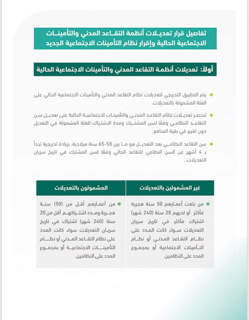وبيّنت المؤسسة أن السن النظامية للتقاعد للفئات المشمولة ستكون ما بين (58 و65) سنة ميلادية، وذلك بزيادة تدريجية تبدأ بـ4 أشهر على السن النظامية الحالية للتقاعد وفقاً لسن المشترك في تاريخ سريان التعديلات، كما أن مدة الاشتراك اللازمة للتقاعد المبكر ستكون ما بين (25 و30) سنة اشتراك، وذلك بزيادة تدريجية تبدأ بـ(12) شهرًا على المدة الحالية اللازمة للتقاعد المبكر وفقاً لمدد الاشتراك في تاريخ سريان التعديلات، فيما يستمر تطبيق نظامي التقاعد المدني والتأمينات الاجتماعية الحاليين دون تغيير على باقي المشتركين ممن أعمارهم (50) سنة هجرية فأكثر أو لديهم مدد اشتراك (20) سنة فأكثر في تاريخ سريان تلك التعديلات.