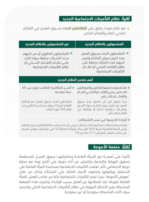 أوضحت المؤسسة العامة للتأمينات الاجتماعية ما تضمنه قرار مجلس الوزراء القاضي بالموافقة على نظام التأمينات الاجتماعية الجديد وقصر تطبيقه على الملتحقين الجدد بالعمل، والموافقة على استمرار العمل بأحكام نظامي التقاعد المدني والتأمينات الاجتماعية بالنسبة إلى المشتركين الحاليين باستثناء الأحكام المتصلة بالسن النظامية للتقاعد والمدة المؤهلة لاستحقاق معاش التقاعد قبل بلوغ تلك السن للفئات المشمولة وفقًا لما نص عليه القرار.