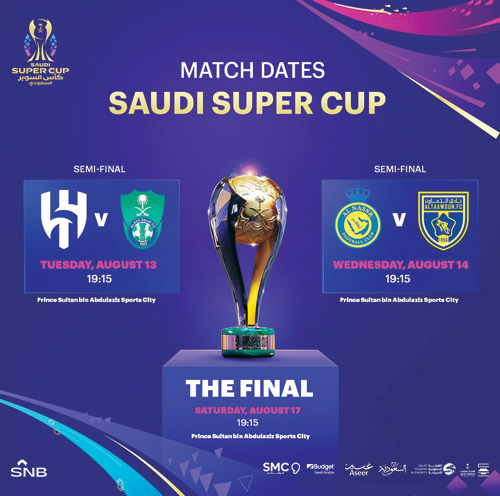 أعلن الاتحاد السعودي لكرة القدم إقامة بطولة كأس السوبر السعودي 2024 في مدينة أبها بمنطقة عسير خلال الفترة 13 - 17 اغسطس المقبل بالتعاون مع هيئة تطوير المنطقة، والهيئة السعودية للسياحة ممثلة بـ «روح السعودية» الهوية الرسمية للسياحة السعودية، والاتحاد السعودي لكرة القدم تزامناً مع موسم صيف عسير 2024 الذي شهد إطلاق الهوية السياحية للمنطقة بعنوان «عسير تهوّل».