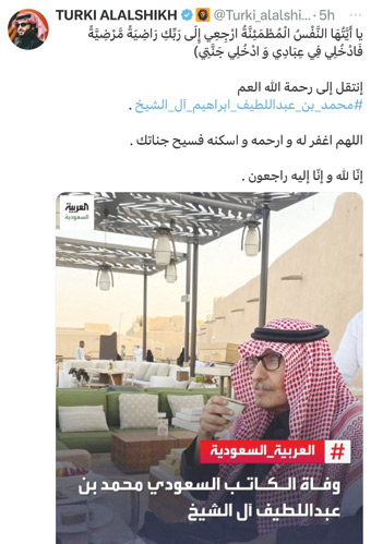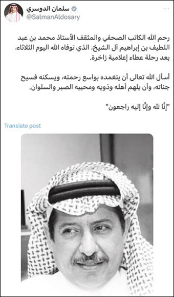وتسابق آلاف المغردين والكتاب وغيرهم من أبناء المملكة العربية السعودية، ودول الخليج والدول العربية في نعي الراحل محمد بن عبداللطيف آل الشيخ صباح يوم أمس (الثلاثاء)، في تعبير عفوي يؤكد مكانة الكاتب الراحل، والدور المؤثر الذي قام به دفاعاً عن ثقافة وفكر المجتمع العربي السعودي والخليجي.