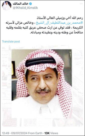 تُوفي الكاتب الصحافي محمد بن عبد اللطيف آل الشيخ؛ يوم أمس (الثلاثاء)، بعد معاناة طويلة مع المرض وكان من أبرز كتّاب أعمدة الصحيفة في زاويته الشهيرة «شيء من» لأكثر من عقدين، وكانت مقالاته مثاراً للجدل والأخذ والرد من قبل الموافقين والمناوئين لأفكاره الاجتماعية والاقتصادية والثقافية، وتميَّز الصحافي محمد بن عبد اللطيف آل الشيخ صاحب الفكر الشجاع والقلم المخلص في أسلوبه الكتابي، في النقد الاجتماعي وترك الراحل بصمة لا تُمحى في عالم الأدب والشعر، وكانت له كتابات شعرية، منها قصيدة غناها الفنان عبد المجيد عبد الله، تقول: «يا بحر جدة ذكرته يوم شفتك»، وكانت كلماته تعبر عن مشاعره العميقة وحبه للوطن.
