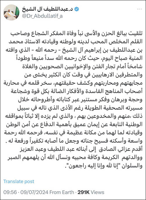 وأضاف وزير الشؤون الإسلامية: «تلقيت ببالغ الحزن والأسى نبأ وفاة المفكر الشجاع، وصاحب القلم المخلص المحب لدينه ولوطنه وقيادته، الأستاذ محمد بن عبد اللطيف بن إبراهيم آل الشيخ -رحمه الله- الذي وافته المنية صباح يوم أمس؛ حيث كان -رحمه الله- سداً منيعاً وطوداً شامخاً أمام تجار الفتن، والإخوانيين الصحويين، والغلاة، والمتطرفين الإرهابيين، في وقت كان الكثير يخشى من مجابهتهم ومحاربتهم وكشف حقيقتهم، وسخر قلمه في محاربة أصحاب المناهج الفاسدة والأفكار الضالة، بكل قوة وشجاعة وحجة وبرهان وفكر مستنير، عبر كتاباته وأطروحاته خلال مسيرته الصحافية الطويلة، رغم الأذى الذي ناله في سبيل ذلك منهم ومن المخدوعين بهم، الذي لم يزده إلا ثباتاً بمواقفه الوطنية النابعة عن إيمان عميق بأهمية الدفاع عن أمن الوطن وقيادته، لما لهما من مكانة عظيمة في نفسه، فرحمه الله رحمة واسعة، وأسكنه فسيح جناته، وجعل ما أصابه تكفيراً ورفعة له. أقدم عزائي الصادق إلى ابنيه عبد اللطيف وعبد العزيز، ووالدتهما الكريمة، وكافة محبيه، ونسأل الله أن يلهمهم الصبر والسلوان. {إِنَّا لِلّهِ وَإِنَّا إِلَيْهِ رَاجِعونَ}.