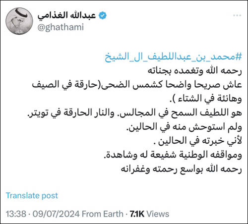 كما نعاه كثير من المثقفين والصحافيين، ورئيس هيئة الترفيه تركي آل الشيخ، على حسابه الرسمي على موقع «إكس»؛ حيث ذكروا مناقبه وبصمته في عالم الأدب والشعر، وقلمه الشجاع في محاربة المناهج الفاسدة والأفكار الضالة.