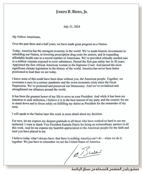 وكتب بايدن في منشور على منصة «إكس»:»لقد كان أعظم شرف في حياتي أن أخدم كرئيسكم.. رغم أنني كنت أعتزم الترشح لإعادة انتخابي.. أعتقد أنه من مصلحة حزبي والدولة أن أتنحى وأركز فقط على أداء واجباتي كرئيس للفترة المتبقية من ولايتي.