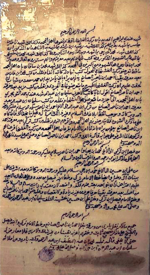 من تركي بن عبدالله إلى الأخ أحمد بن ناصر سلّمه الله - سلام عليكم ورحمة الله وبركاته- وموجب الخط بلاغكم السلام وغير ذلك أمر آل دخيل ما يخفاك فإن كان على ما ذكر الشهود فلا يتعرضونهم أهل المجمعة، واقرعهم عنهم ونقله من كتب تركي بعد معرفته أحمد بن ناصر الصانع.