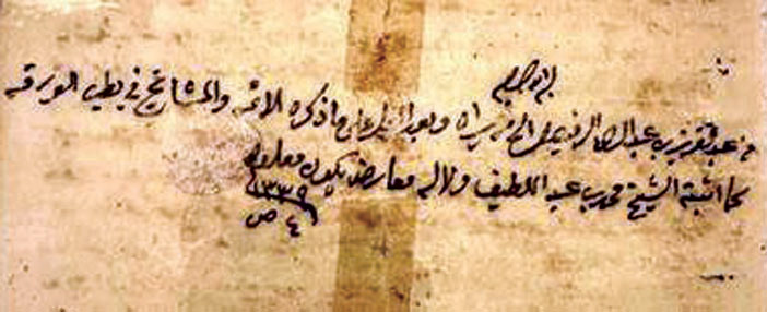 من عبدالرحمن بن حسن إلى الأخ الإمام فيصل سلمه الله تعالى السلام عليكم ورحمة الله وبركاته وبعد.. سلمك الله بينات أهل الحسي وأهل الفشخا تشرف عليها كذلك خط الشيخ عبدالله وكتب والدك رحمه الله تعالى تحته فلا لاعتراض لأهل المجمعة مع هالخطوط اللي معهم وجه وأنت سالم والسلام.